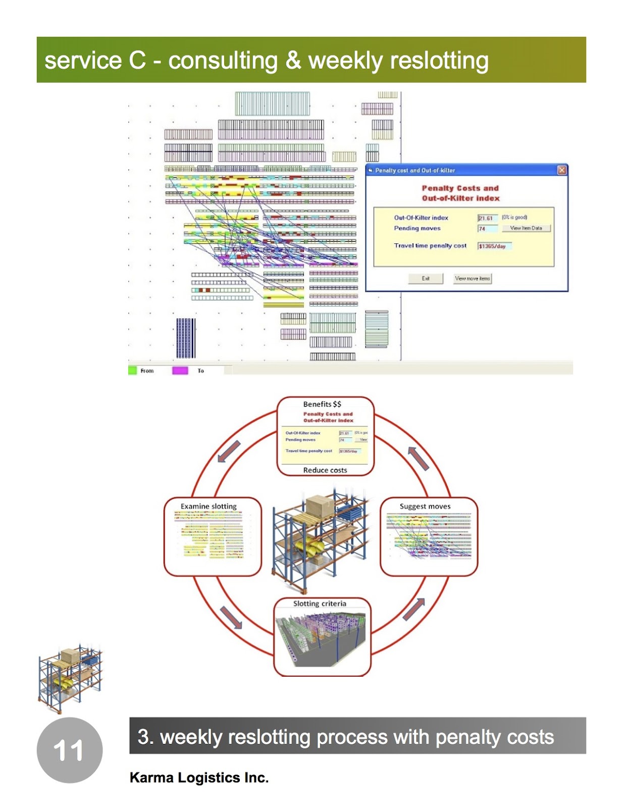 Karma Logistics Inc, a Minnesota USA based corporation provides both consulting and software-as-a-service offerings. We focus on DC profiling, layout, slotting, simulation. Our clients have seen labor and space productivity improvements in the range of 12% to 25%.